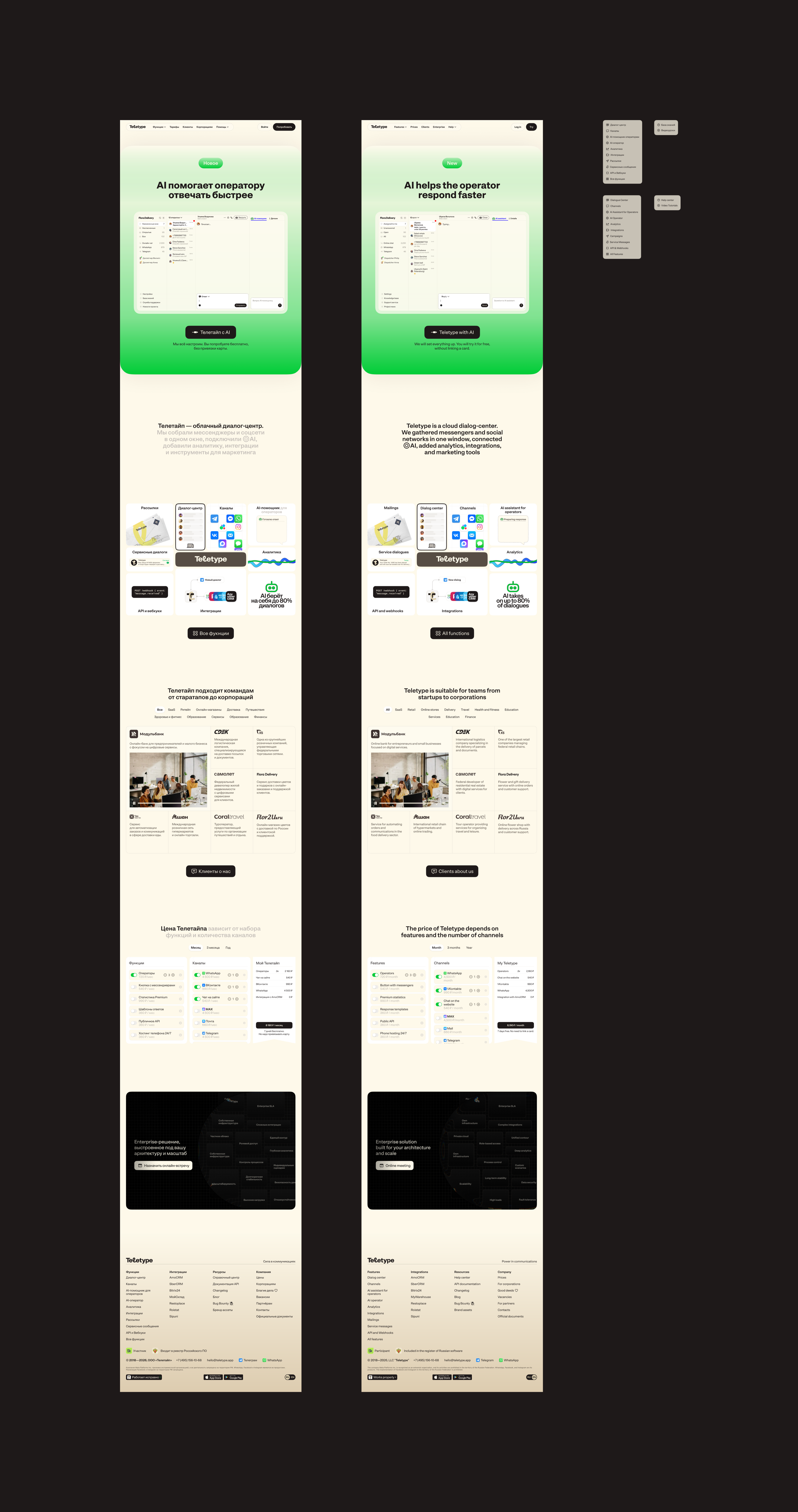Телетайп — облачный диалог-центр для бизнеса. Сервис собрал мессенджеры, соцсети, почту и сайт-чат в одном окне, объединил разрозненные обращения в единую историю общения, подключил AI-агентов, добавил аналитику, интеграции и маркетинговые инструменты.